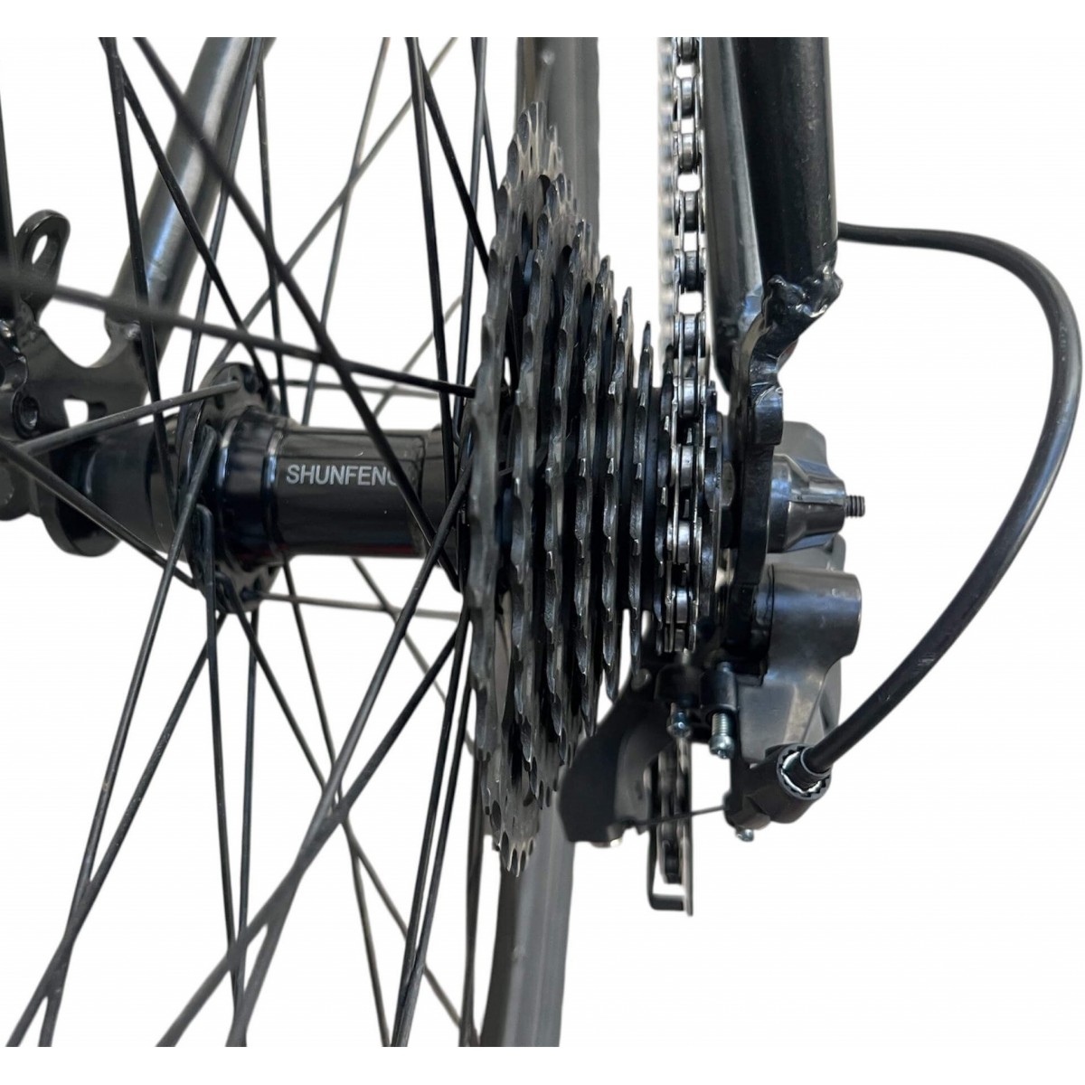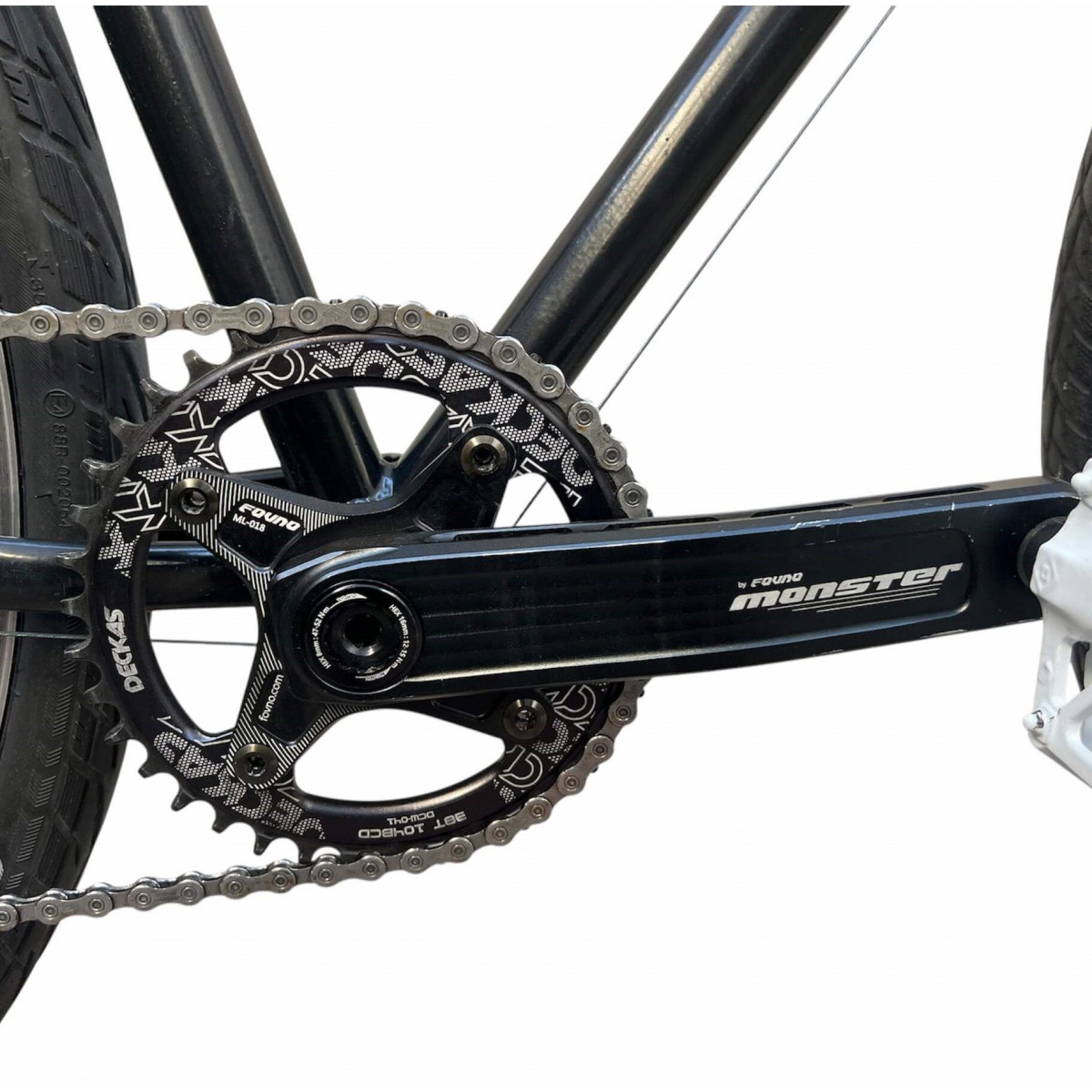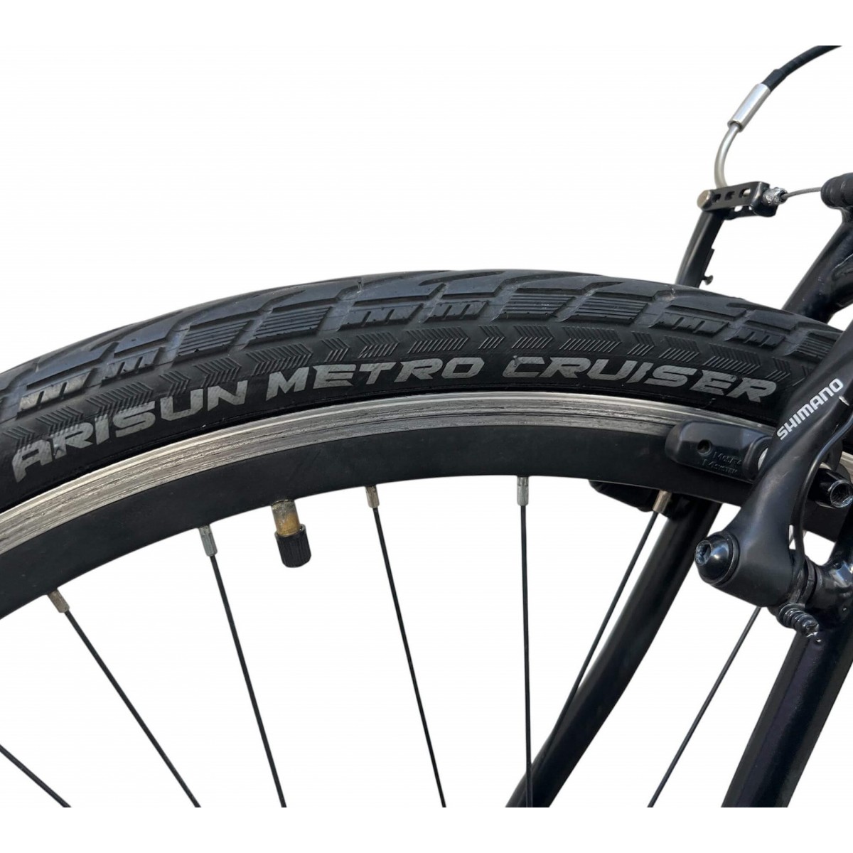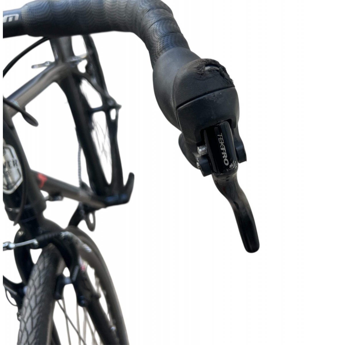 Está equipada con un cuadro talle 49 de pierna, con un monoplato con palancas Founo y plato Deckas de 38 dientes, un shifter Shimano CUES de 9 velocidades, una pata de cambios trasera Shimano Cues, piñón de 9 coronas, y un sistema de frenos v-bracke marca Shimano, con manijas tipo ergo Tektro. Las ruedas estan armadas con aros de doble pared de aluminio, cubiertas Arisun 700x38 (trasera) y 700x32 (delantera) que te darán un excelente rendimiento sobre todo en asfaltos.