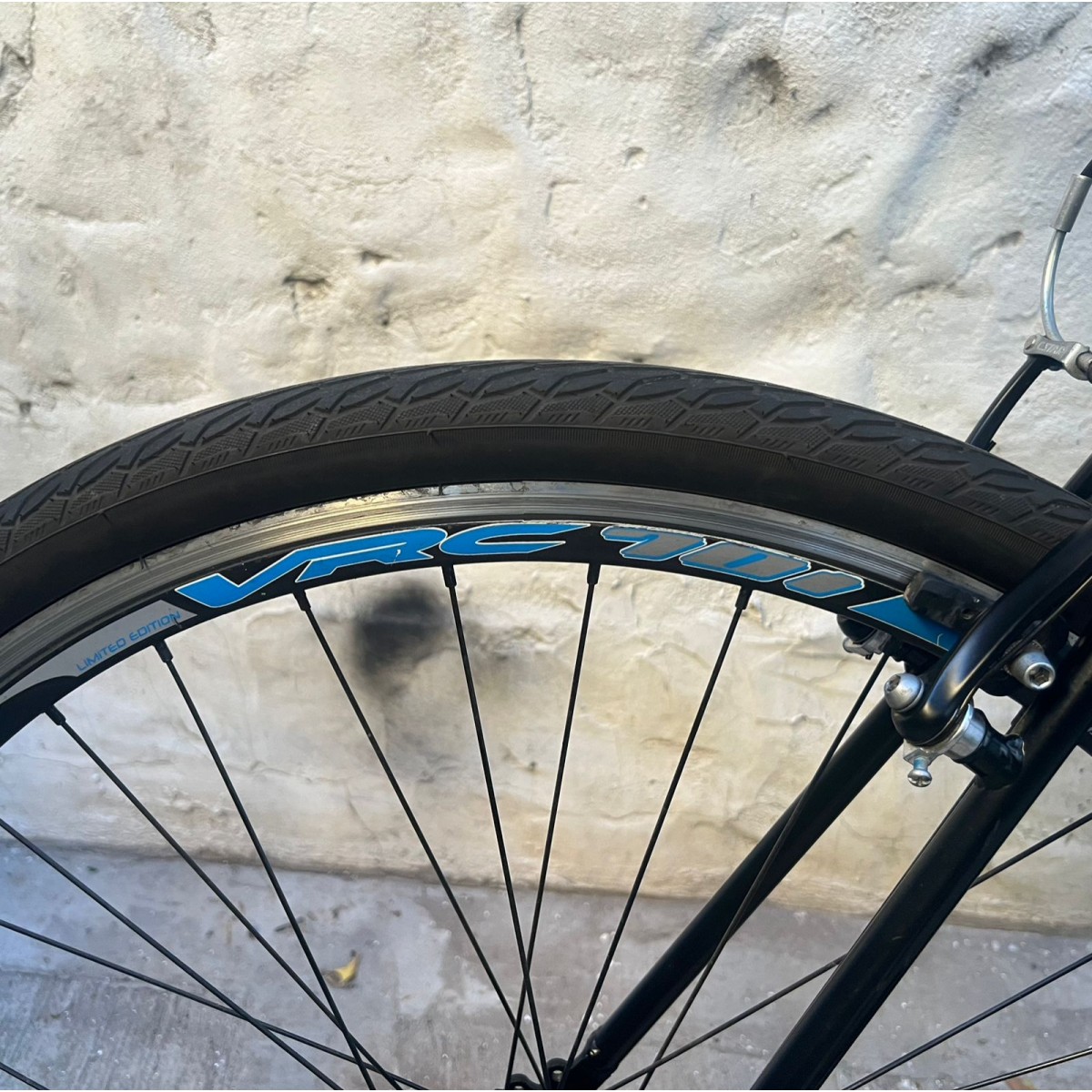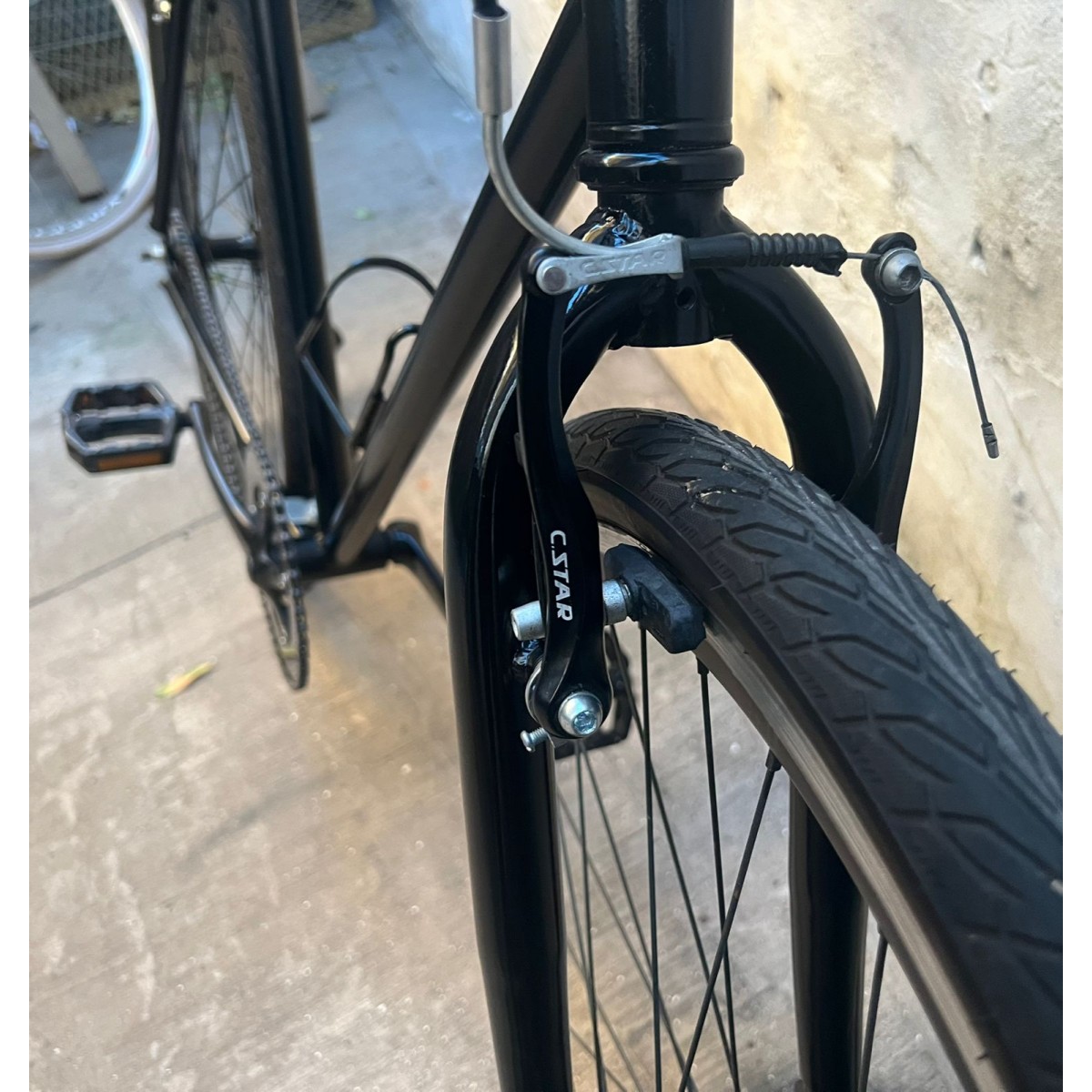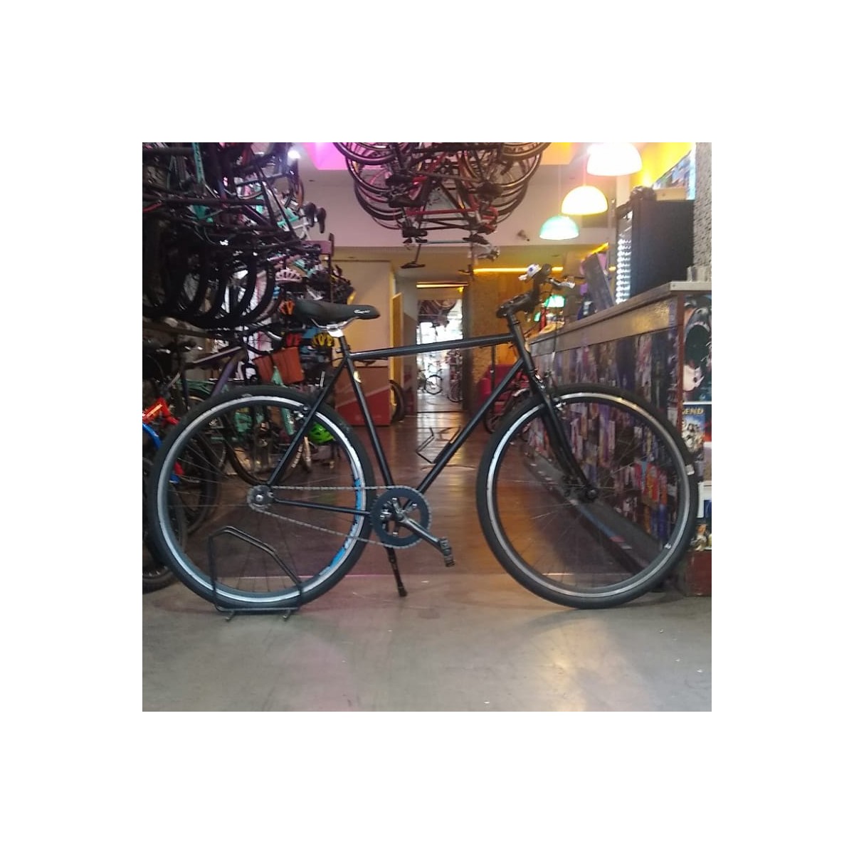 Equipada con ruedas rodado 28, cubiertas anchas 700x40 para soportar todo en el asfalto, mazas de calidad, aro doble pared de aluminio, frenos v-brake, manubrio de aluminio, puños de goma, pedales de plataforma, monoplato, y pinón de 1 sola marcha, un asiento antiprostático confortable, y un cuadro de acero 1010 FAD talle 56.