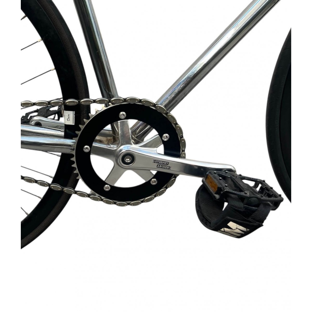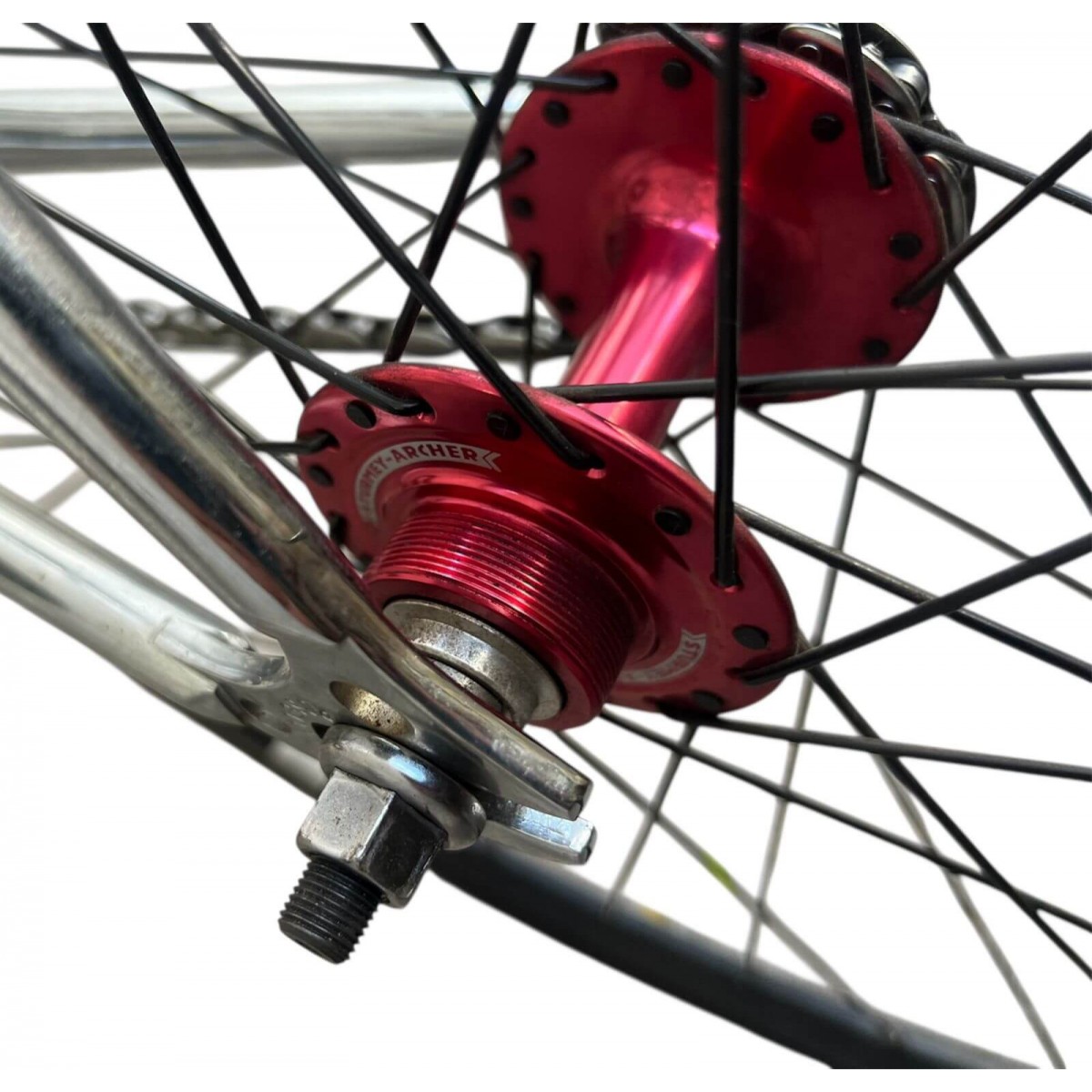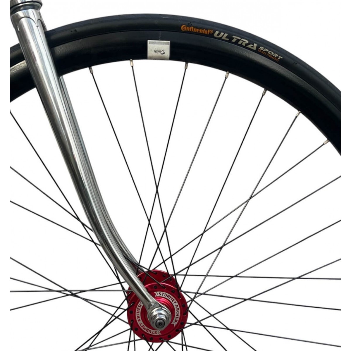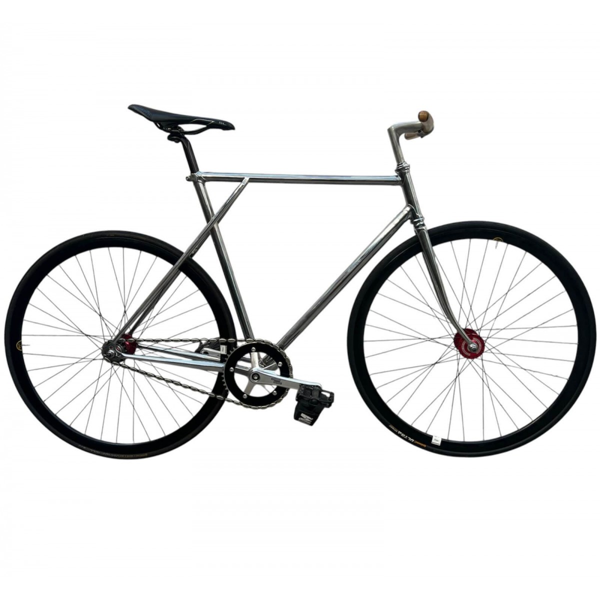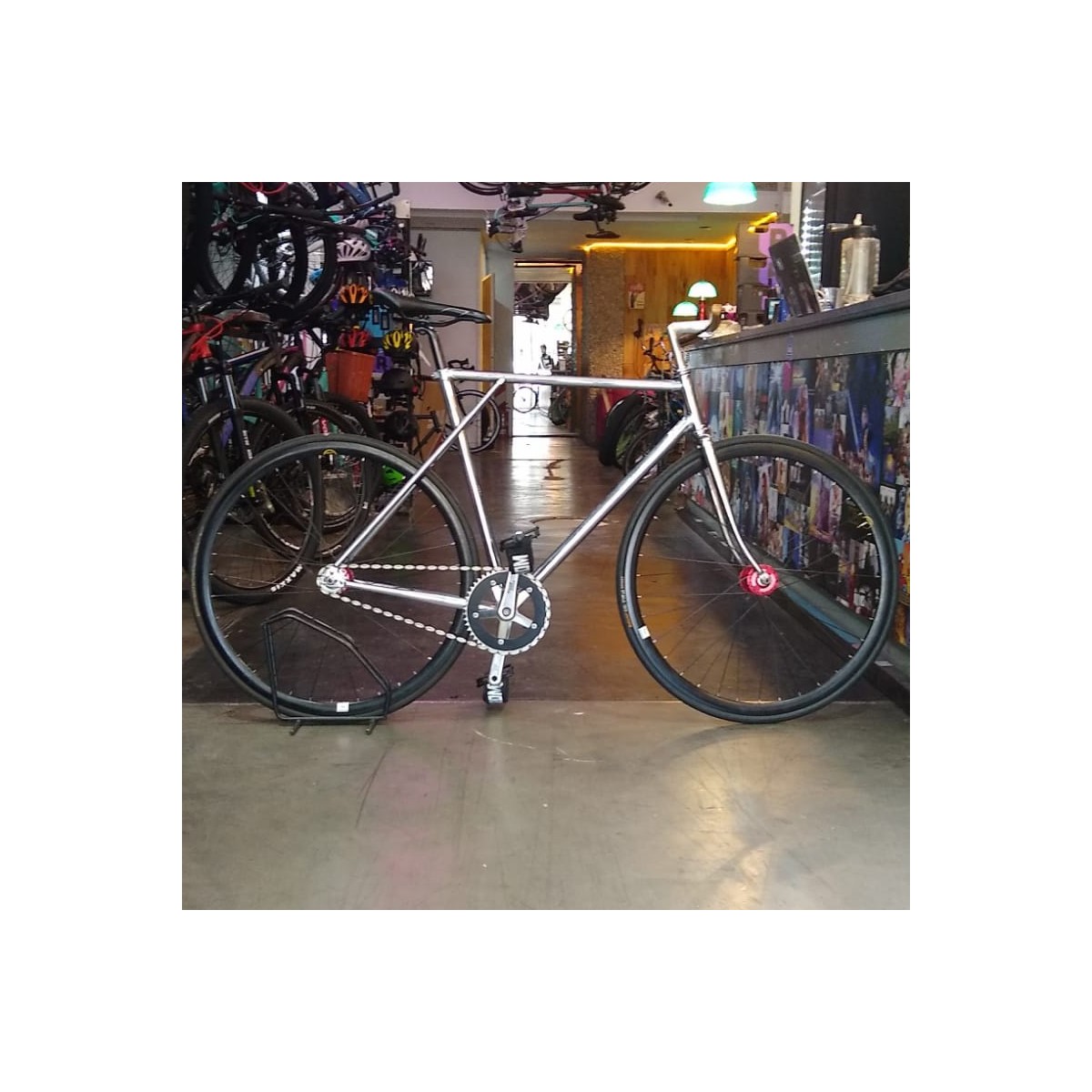 Las fixies tienen magia si detrás de ellas hay un gran cuadro y un taller que sabe armarlas, balanceando los componentes en base a tus gustos y posibilidades, pero cuidando también el balance en las calidades de los componentes. En este caso te presentamos esta fixie, armada con un frame del famoso cuadrista Roselli (una joya que ya no se consigue), con una horquilla Giorgia, equipada con un cuadro triple triángulo en acero cromado (tubería Columbus) con pipas en sus uniones, disponible en talle 58x58, con mazas a rulemán marca Sturmey Archer en color rojo, aros de doble pared de aluminio marca Dialcar, cubiertas 700*23 marca Continental Ultra Sport. El plato y palanca, son también de aluminio de la marca Sturmey Archer FCT 68D 48 dientes, caja pedalera Shimano, la cadena de eslabones reforzados Shimano (no se consiguen más), pedales de plataforma de aluminio Wellgo negros, con straps Velocrom con reflectivo, asiento Selle Italalia negro, manubrio de madera para hacerla bien agresiva y con un aspecto diferencial a lo que encontrarás en la calle.
