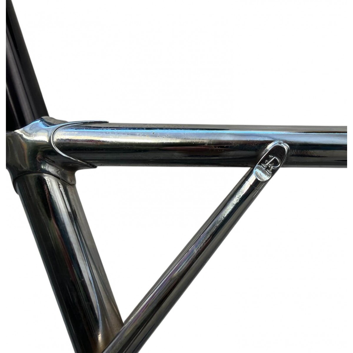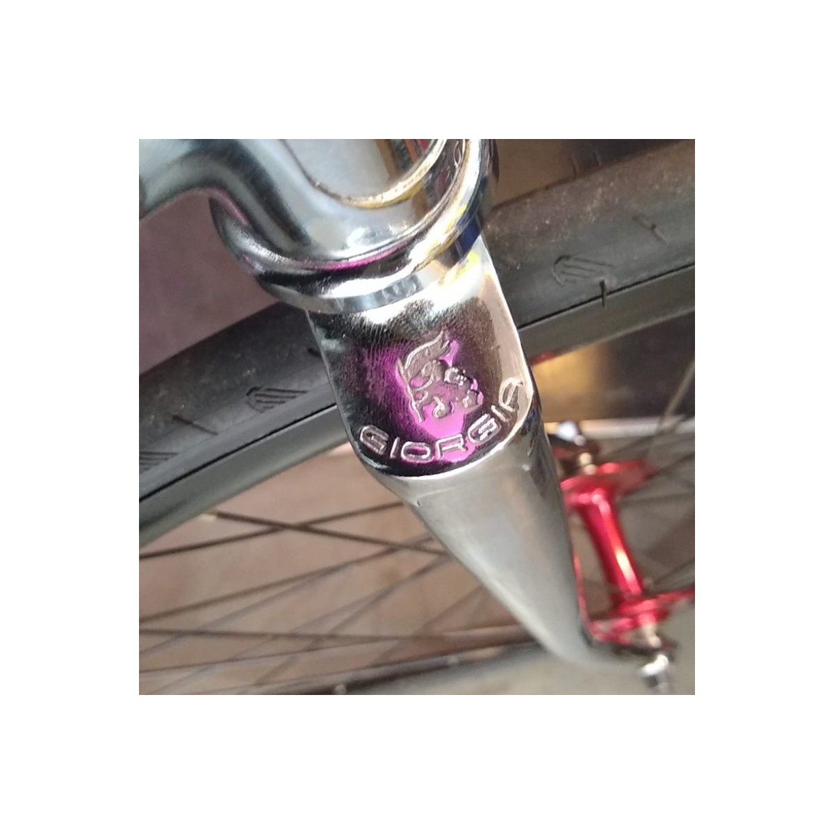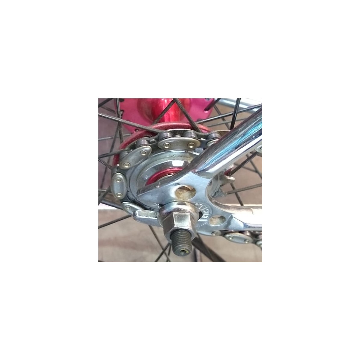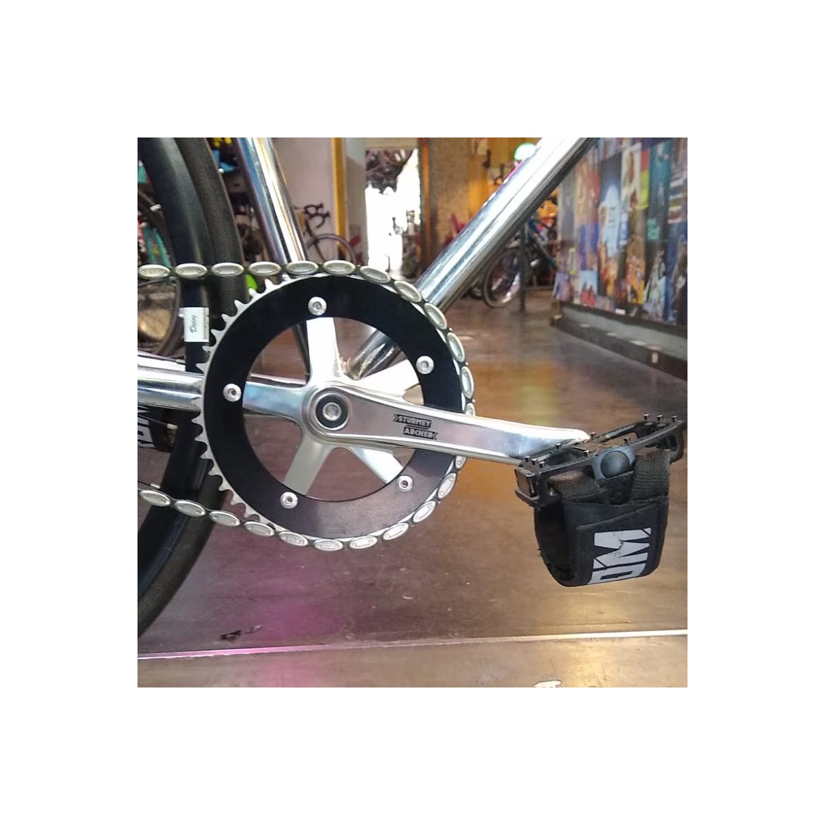 Las fixies tienen magia si detrás de ellas hay un gran cuadro y un taller que sabe armarlas, balanceando los componentes en base a tus gustos y posibilidades, pero cuidando también el balance en las calidades de los componentes. En este caso te presentamos esta fixie, armada con un frame del famoso cuadrista Roselli (una joya que ya no se consigue), con una horquilla Giorgia, equipada con un cuadro triple triángulo en acero cromado (tubería Columbus) con pipas en sus uniones, disponible en talle 58x58, con mazas a rulemán marca Sturmey Archer en color rojo, aros de doble pared de aluminio marca Dialcar, cubiertas 700*23 marca Continental Ultra Sport. El plato y palanca, son también de aluminio de la marca Sturmey Archer FCT 68D 48 dientes, caja pedalera Shimano, la cadena de eslabones reforzados Shimano (no se consiguen más), pedales de plataforma de aluminio Wellgo negros, con straps Velocrom con reflectivo, asiento Selle Italalia negro, manubrio de madera para hacerla bien agresiva y con un aspecto diferencial a lo que encontrarás en la calle.