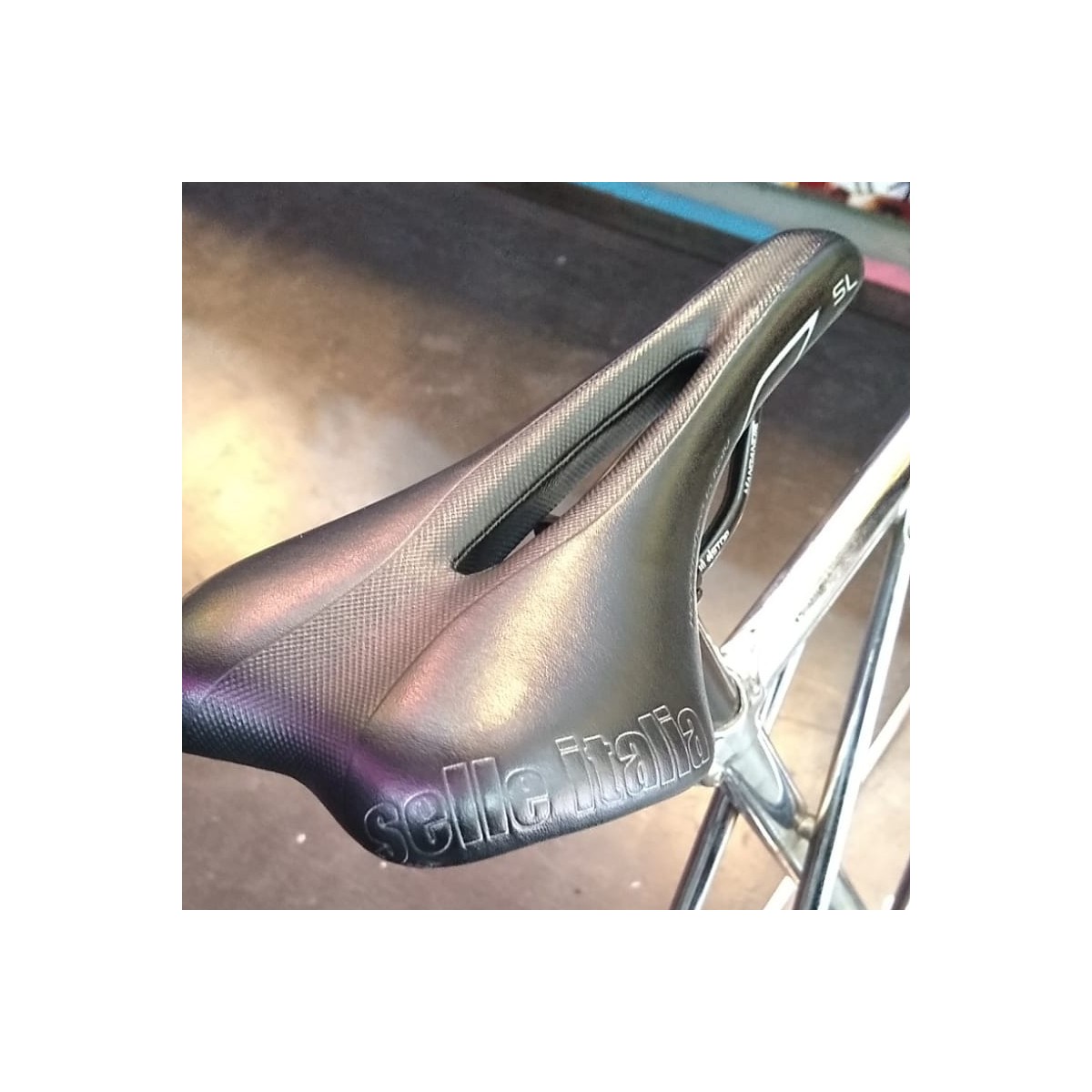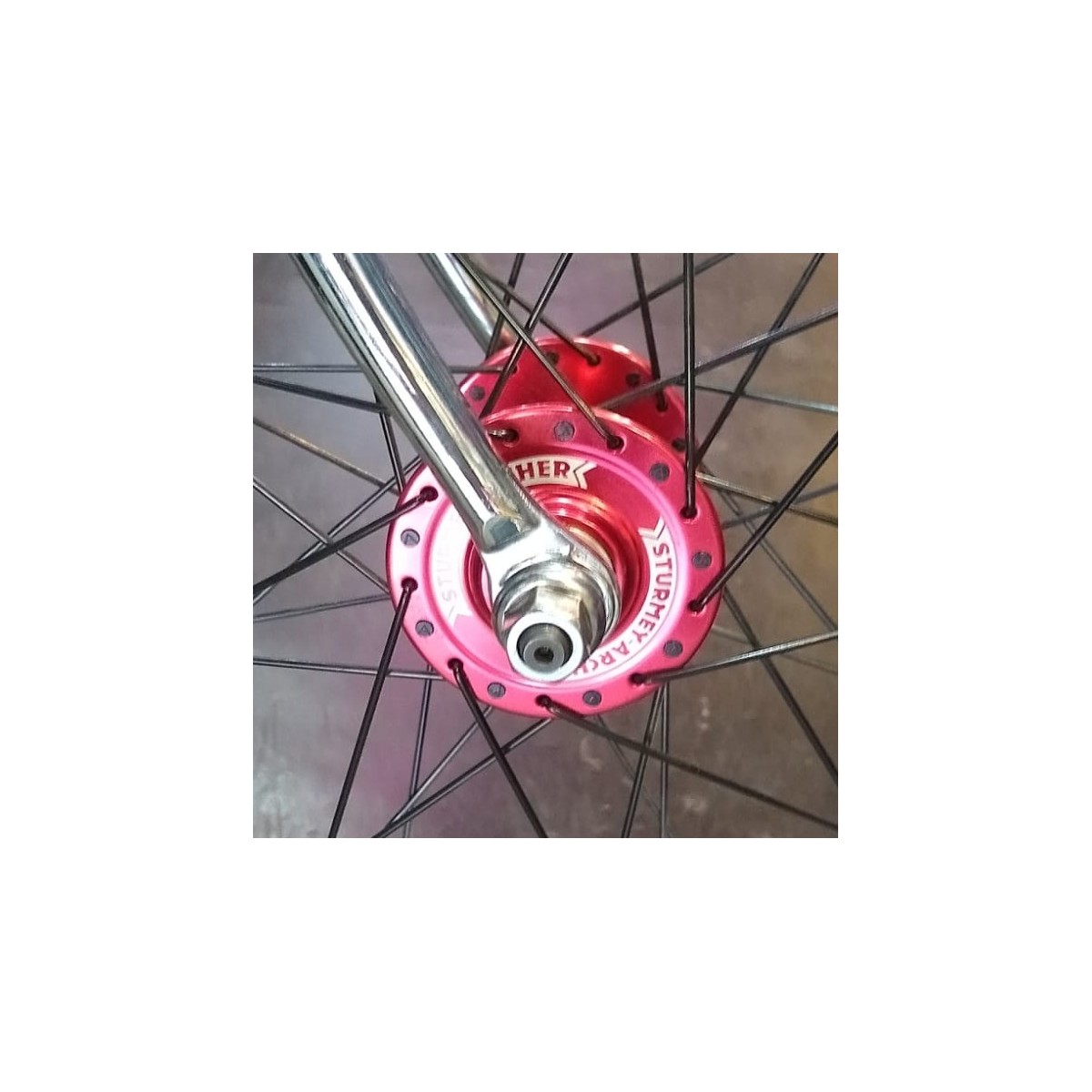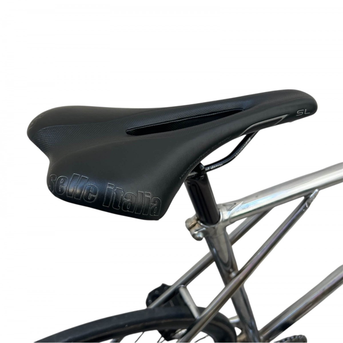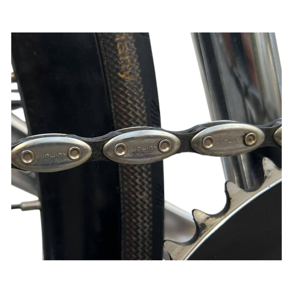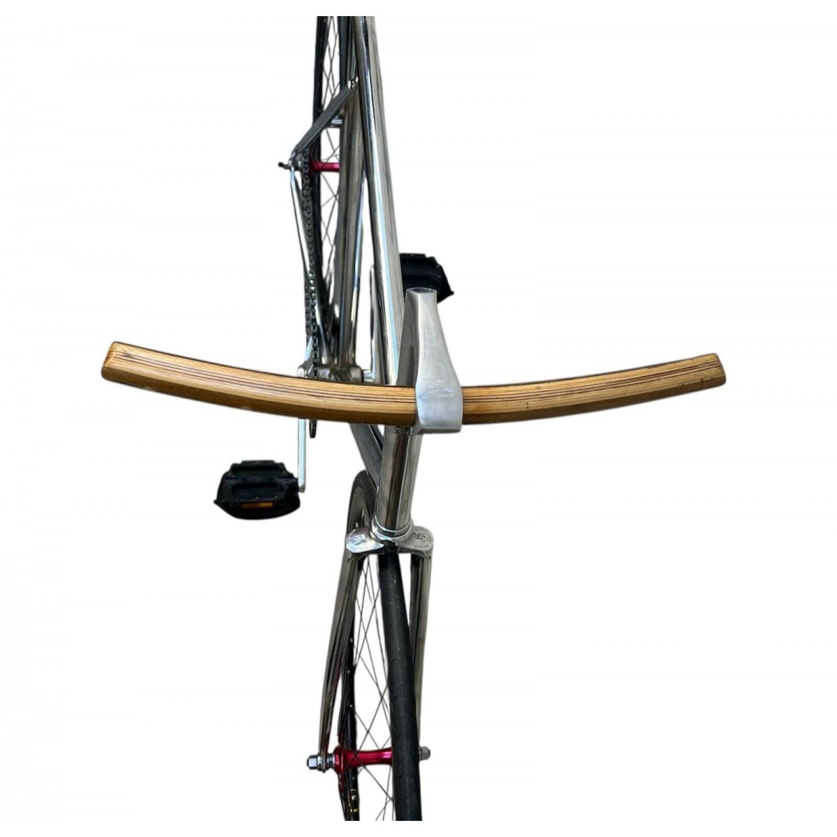 Las fixies tienen magia si detrás de ellas hay un gran cuadro y un taller que sabe armarlas, balanceando los componentes en base a tus gustos y posibilidades, pero cuidando también el balance en las calidades de los componentes. En este caso te presentamos esta fixie, armada con un frame del famoso cuadrista Roselli (una joya que ya no se consigue), con una horquilla Giorgia, equipada con un cuadro triple triángulo en acero cromado (tubería Columbus) con pipas en sus uniones, disponible en talle 58x58, con mazas a rulemán marca Sturmey Archer en color rojo, aros de doble pared de aluminio marca Dialcar, cubiertas 700*23 marca Continental Ultra Sport. El plato y palanca, son también de aluminio de la marca Sturmey Archer FCT 68D 48 dientes, caja pedalera Shimano, la cadena de eslabones reforzados Shimano (no se consiguen más), pedales de plataforma de aluminio Wellgo negros, con straps Velocrom con reflectivo, asiento Selle Italalia negro, manubrio de madera para hacerla bien agresiva y con un aspecto diferencial a lo que encontrarás en la calle.