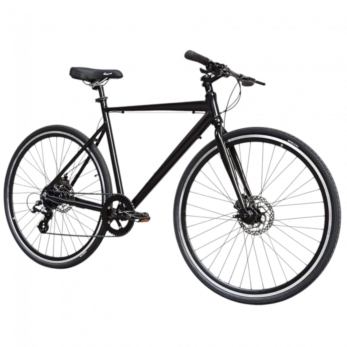 En este caso, te presentamos una híbrida personalizable, modelo España. La armamos con un nuevo cuadro de aluminio, con una simetría especial, bien compacta y además con un corte en el triángulo de las vainas por debajo de la unión con el tubo superior, lo que le ofrece a la bici un muy bajo peso, de apenas 11.4 kilogramos armada completa. Equipada con un monoplato potente que te dará muy buena velocidad y un piñón Shimano de 8 velocidades que te brindará subidas en pendientes con menos esfuerzo, y alta velocidad en llano. La entregamos con un sistema de frenos a disco mecánico Shimano, un shifter Shimano Altus bien compacto con visor, mazas a rulemán con cierre rápido en ambas ruedas, para facilitar el desmonte de la rueda delantera y meter la bici en lugares de poco espacio.