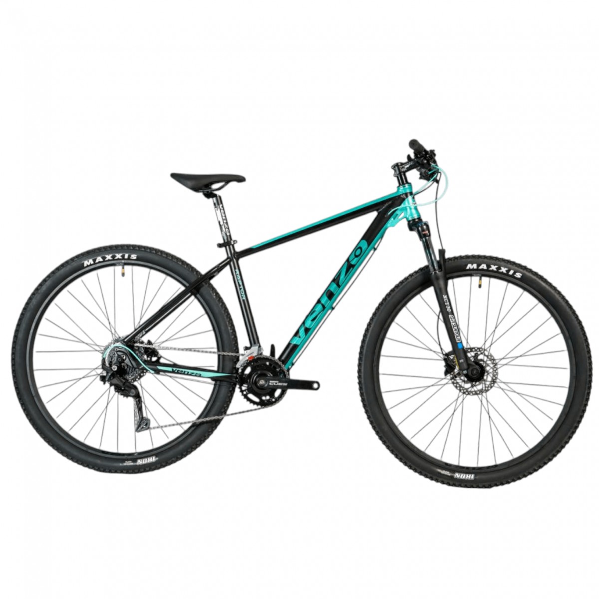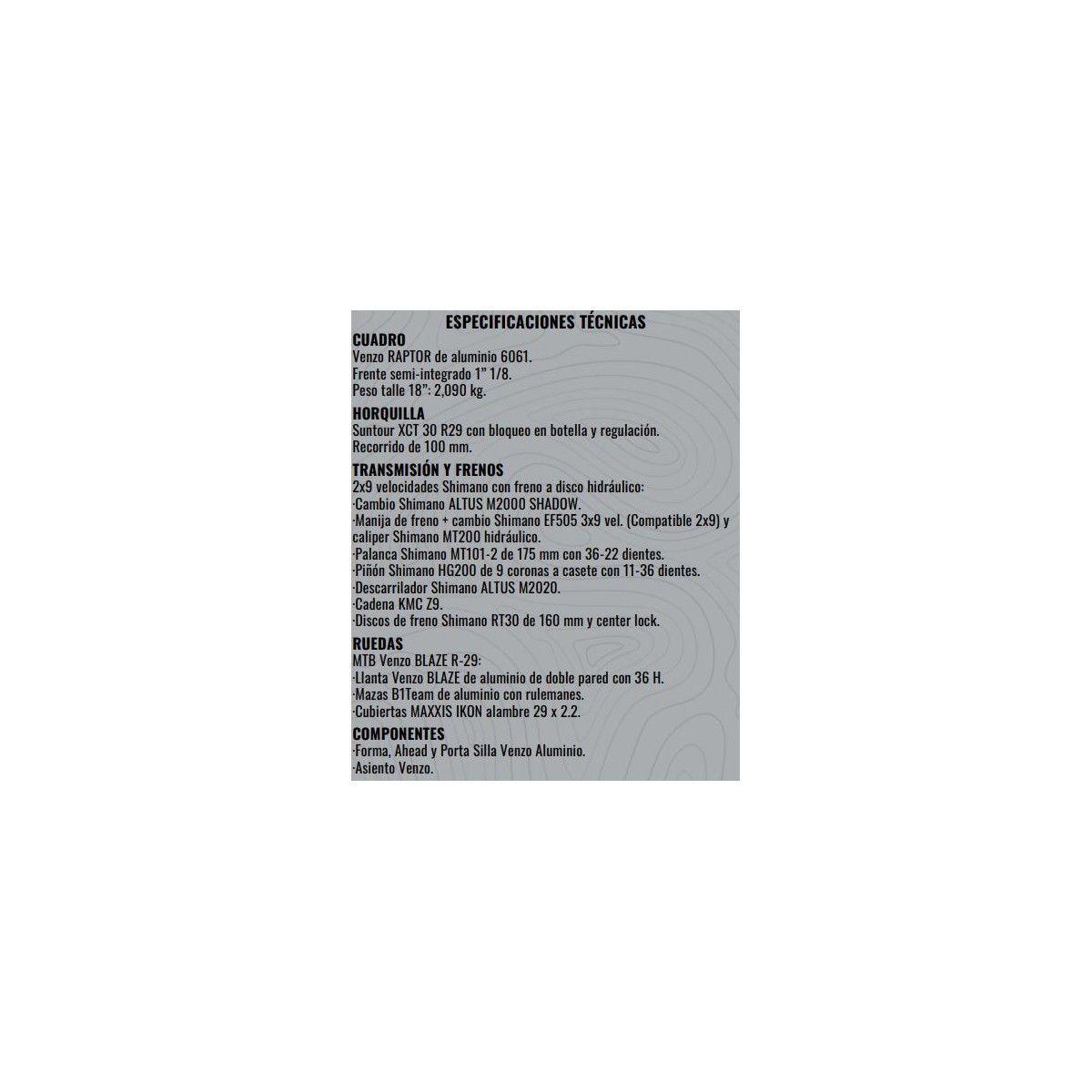 En esta oportunidad Venzo nos acerca una nueva versión de su VENZO RAPTOR rodado 29, con transmisión Shimano Altus, biplato Shimano y piñón Shimano de 9 coronas (18 velocidades totales). Viene equipada con cubiertas Maxxis Ikon 29x2.10 , y aros de doble pared de aluminio, junto con un juego de mazas de aluminio a rulemanes, deal para aquellas personas que se animan a un poco más que andar por el asfalto y ya elijen recorrer caminos rurales o terrenos más exigentes. Los cuadros de esta nueva Venzo Raptor, brindan una línea de colores renovada, con terminación metalizada, letras con acabado pulido, y diferentes colores en sus detalles, además de tener cableado interno. En los controles trae shifters Shimano EF505, frenos hidráulicos Shimano MT-200, con discos Shimano RT-26 de 160 mm. La amortiguación es marca Sr. Suntour con regulación y bloqueo a la botella de la horquilla .